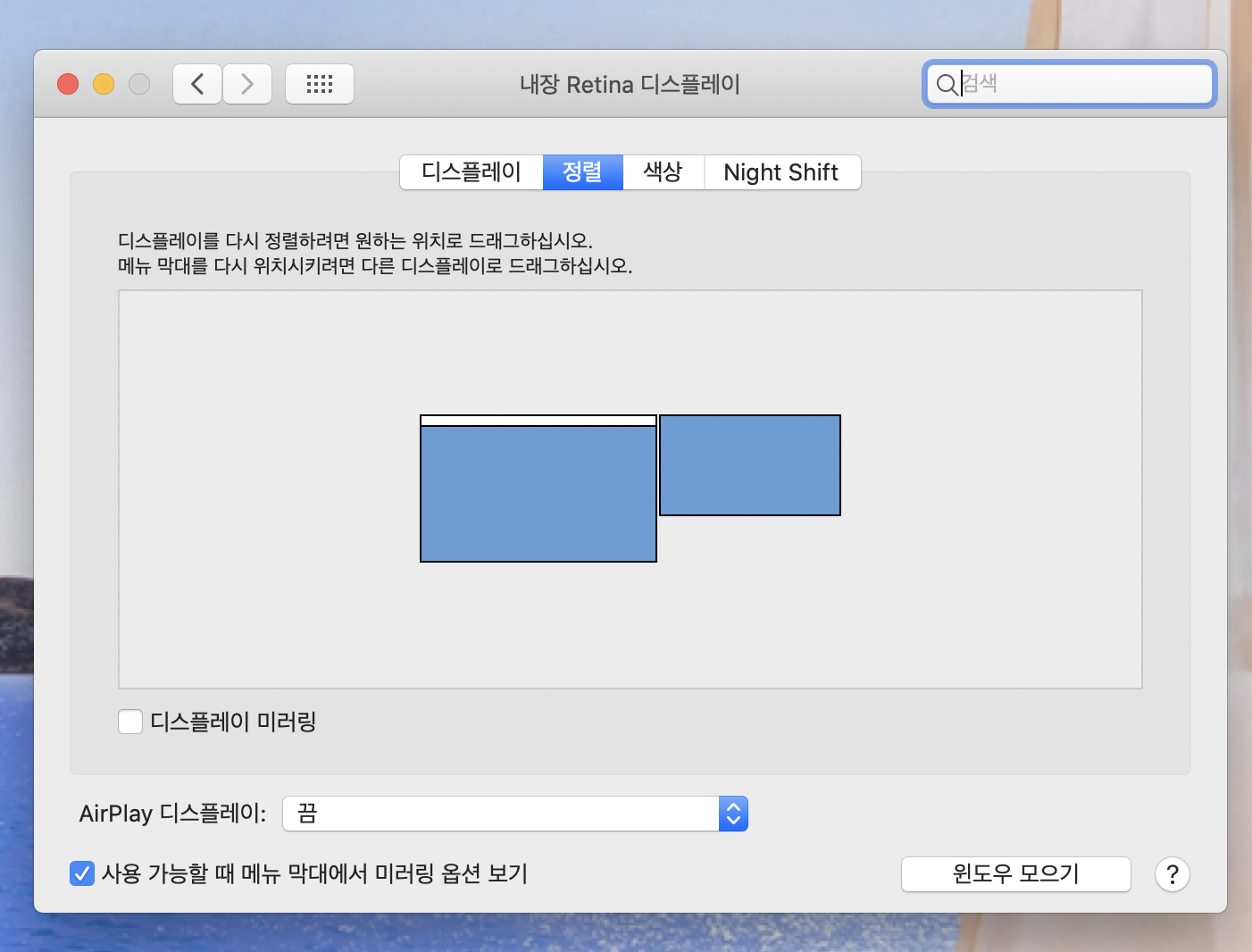 아래쪽 '디스플레이 미러링'을 해제해주면